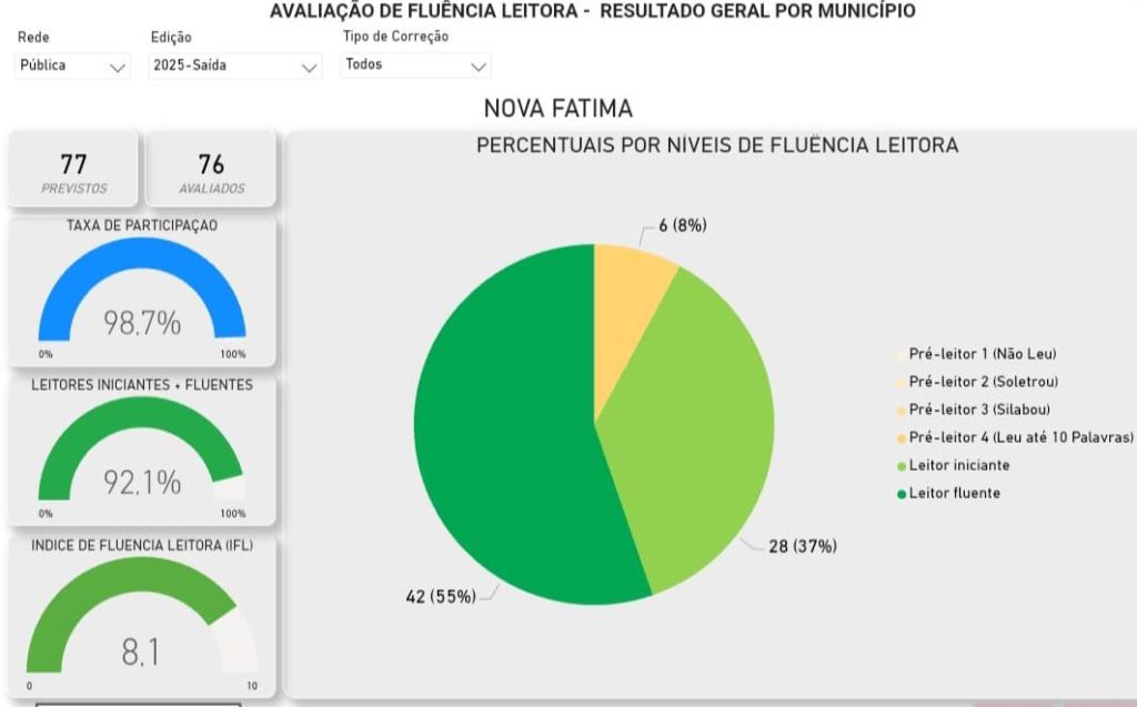 O município de Nova Fátima comemorou um importante avanço na educação após a divulgação dos resultados da Avaliação de Fluência Leitora. Em apenas um ano, o índice do município saltou de 3,7 em 2024 para 8,1 em 2025, demonstrando uma evolução significativa no processo de alfabetização das crianças da rede municipal.