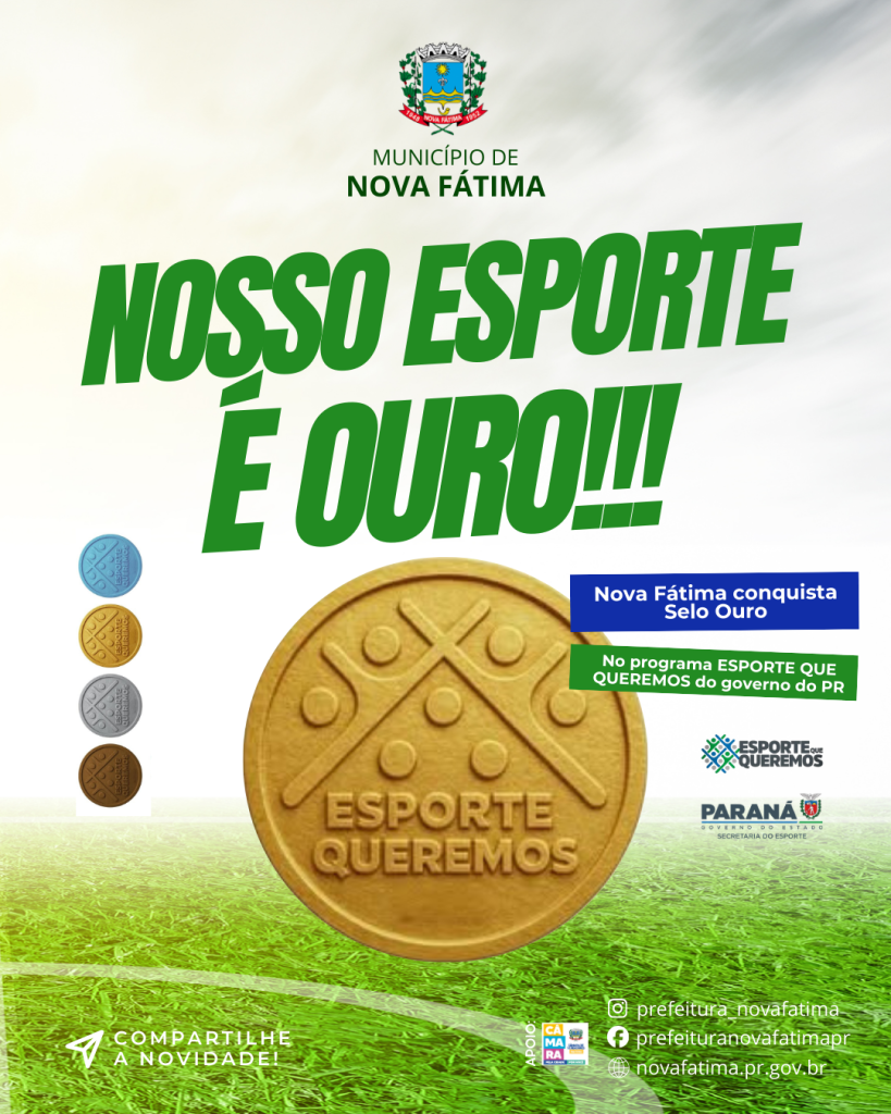 O município de Nova Fátima conquistou nesta semana o Selo Ouro no programa “O Esporte Que Queremos”, iniciativa do Governo do Paraná, coordenada pela Secretaria de Estado do Esporte, que tem como objetivo fortalecer e incentivar o desenvolvimento de políticas públicas esportivas nos municípios paranaenses.